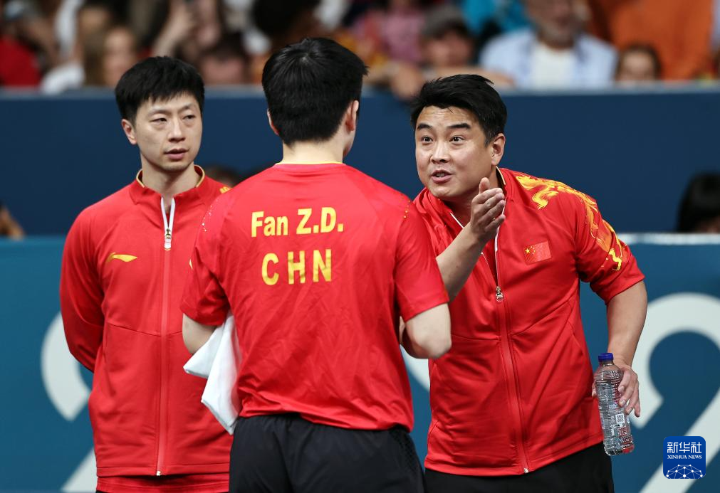 8月9日,樊振東(中)接受王皓(右)指導(dǎo)。新華社記者 王東震 攝