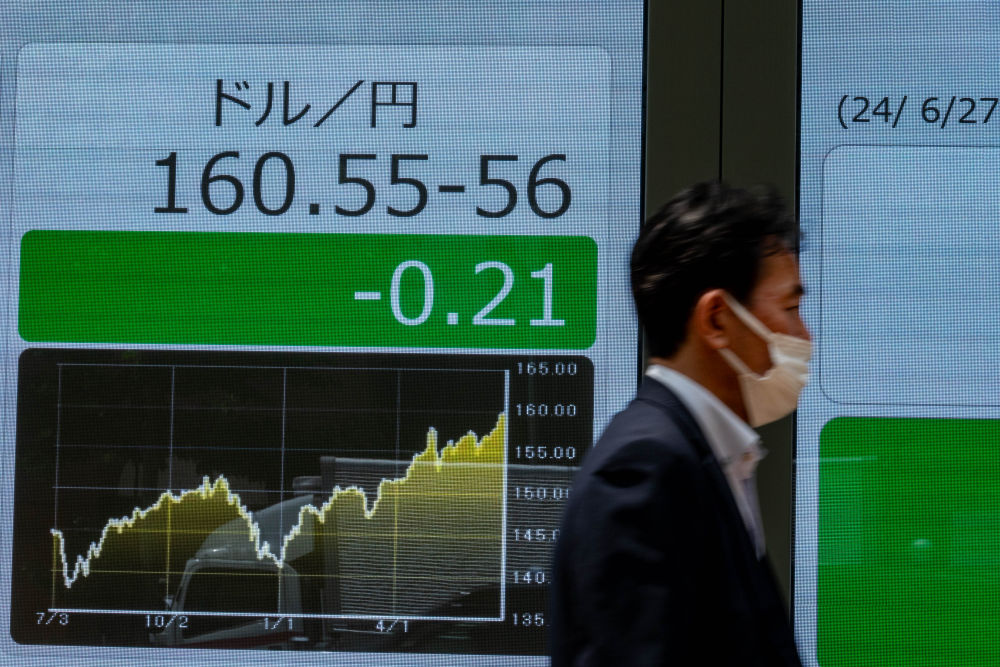 6月27日,行人走過日本東京一處顯示實時匯率的電子屏幕。新華社記者張笑宇攝