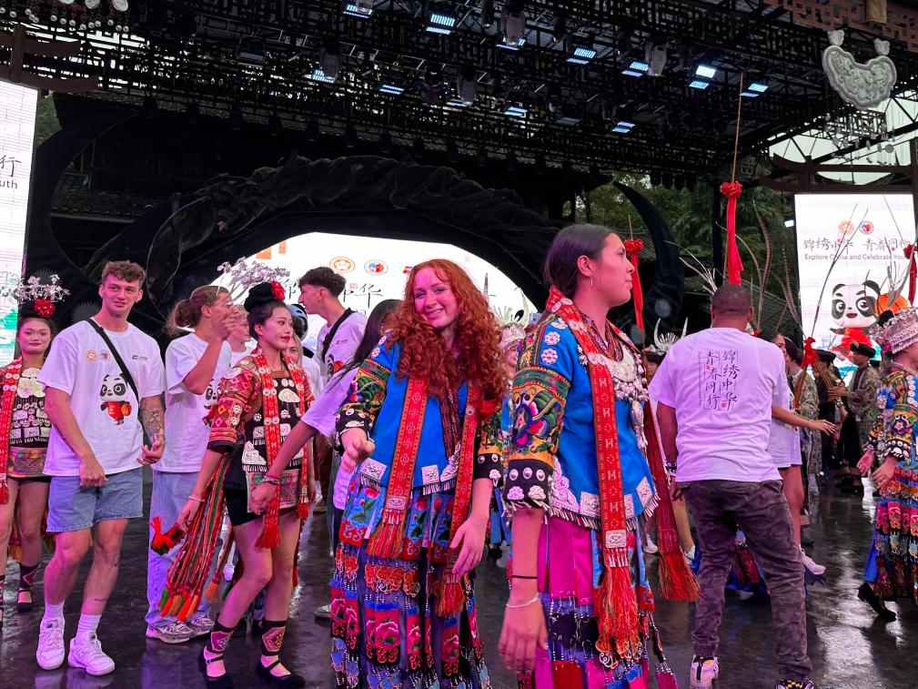 9月16日,美國青少年在貴州西江千戶苗寨體驗苗族服飾及舞蹈。新華社記者 袁睿 攝