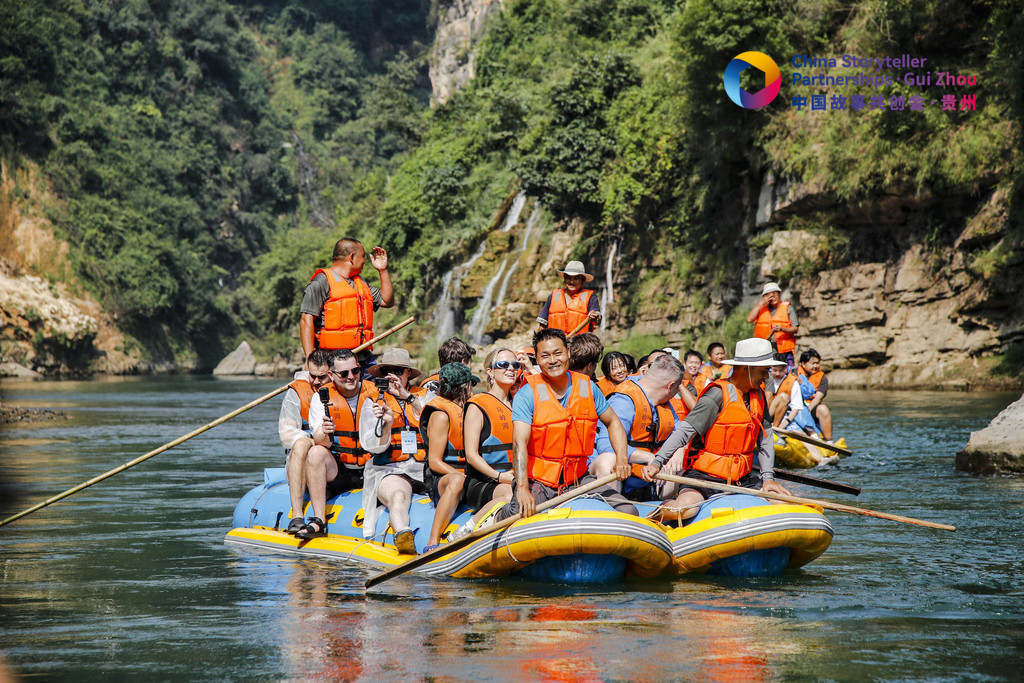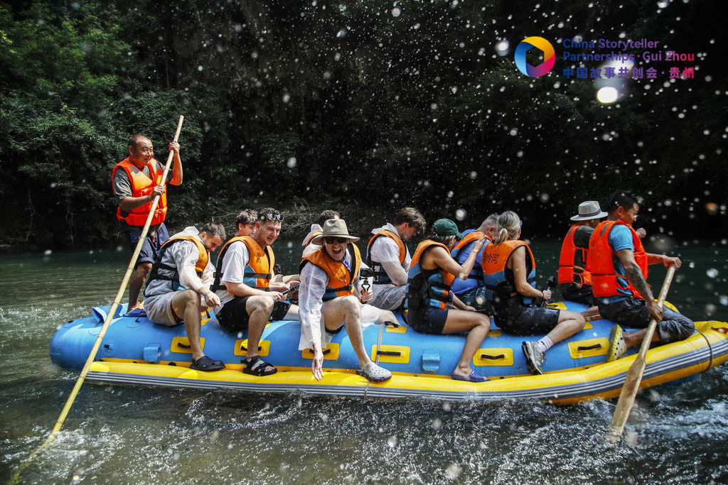 采訪團外籍成員在興義市馬嶺河峽谷體驗漂流戲水,享受清涼時光。