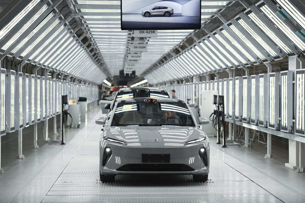 這是安徽省合肥市新橋智能電動汽車產業(yè)園蔚來第二工廠內的新能源汽車生產線(5月9日攝)。新華社記者張端攝