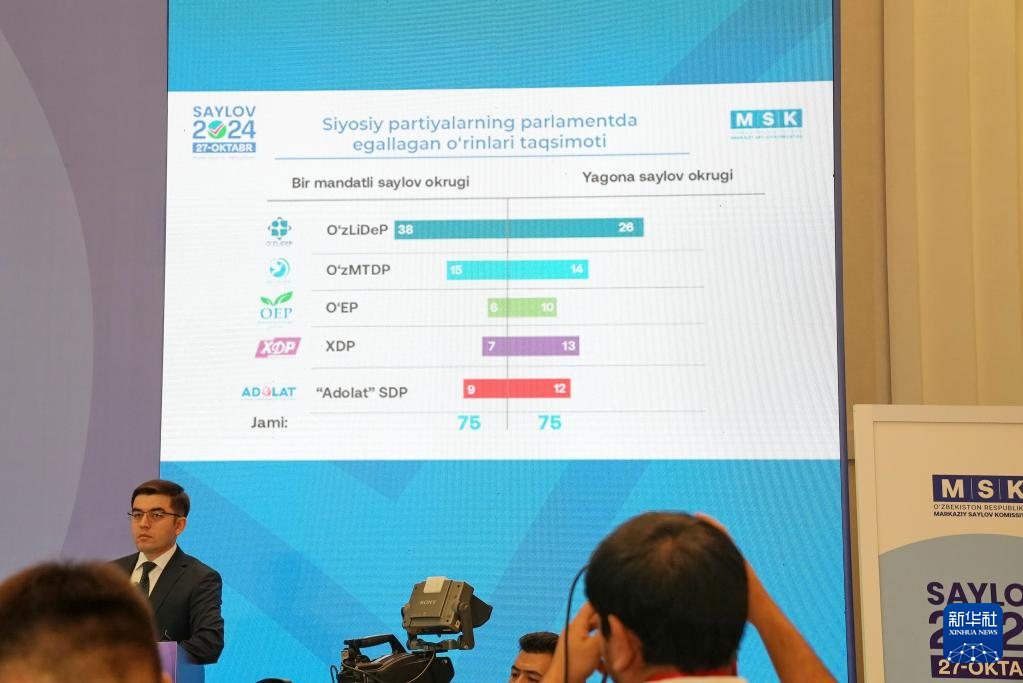 10月28日,烏茲別克斯坦中央選舉委員會在首都塔什干舉行新聞發布會宣布烏最高會議立法院(議會下院)選舉初步結果。新華社發(扎法爾攝)