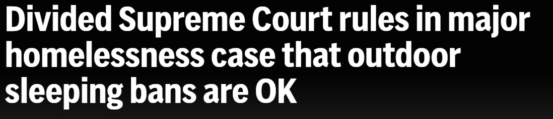 更令人唏噓的是,面對越來越多的人流浪街頭,今年6月底,美國最高法院以6:3的判決結果,允許各地政府實施禁止無家可歸者在戶外露宿的禁令。