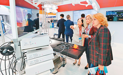 觀眾在白俄羅斯中白工業園舉行的2024中國醫學裝備(白俄羅斯)展覽會上參觀。 任科夫攝(新華社發)