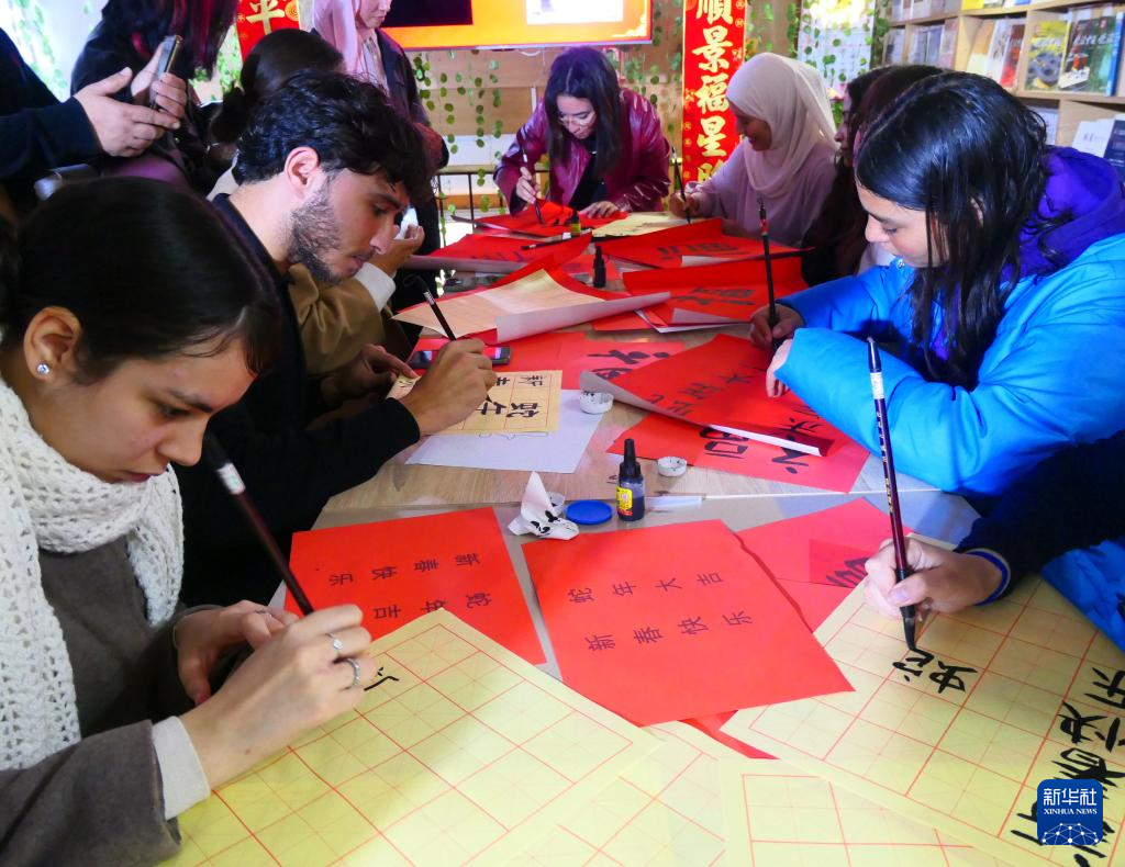 2月1日,在突尼斯首都突尼斯市東方知識書店,中文學習者在春節相關文化活動中學寫祝福語。新華社發(黃靈攝)