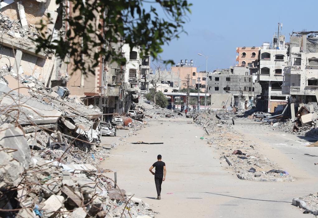 2024年10月9日,在加沙地帶北部杰巴利耶,一名男子從建筑廢墟旁走過。新華社發(阿卜杜勒拉赫曼·薩拉馬攝)