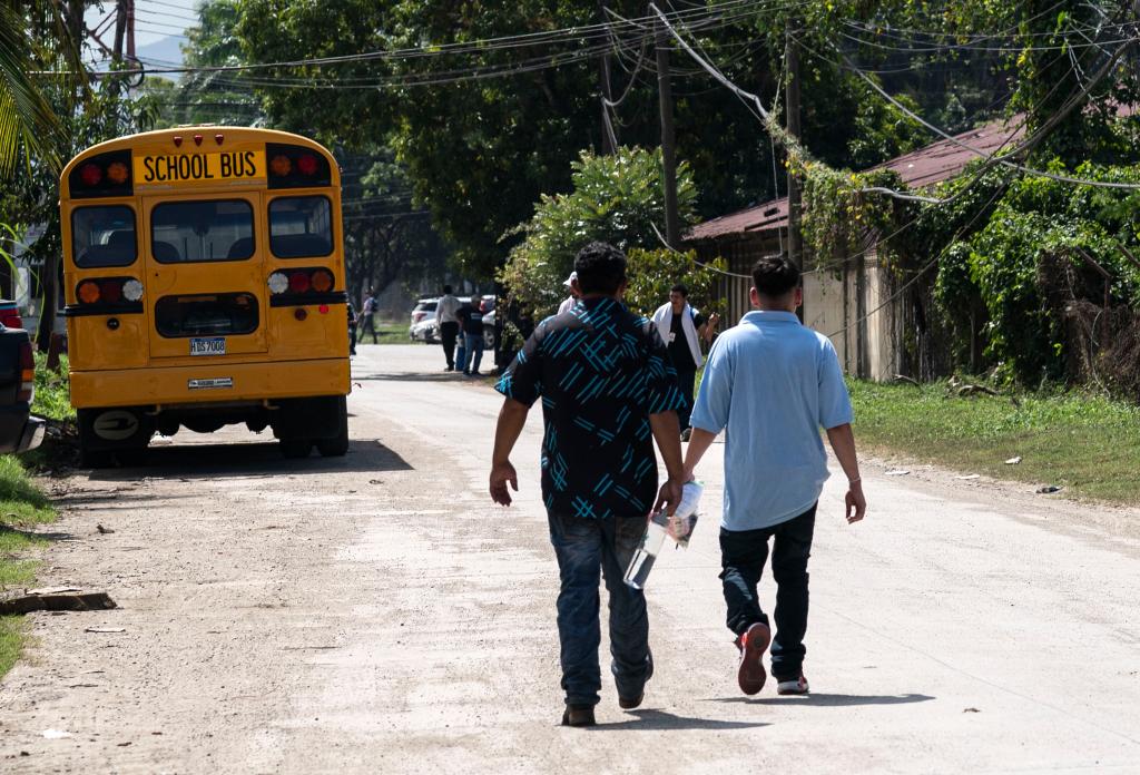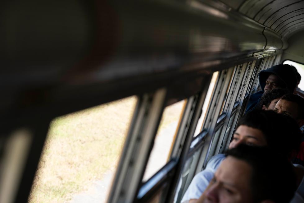 2月14日,在洪都拉斯西北部城市圣佩德羅蘇拉,返鄉移民乘坐返鄉移民援助中心的巴士前往車站。新華社發(戴維 攝)