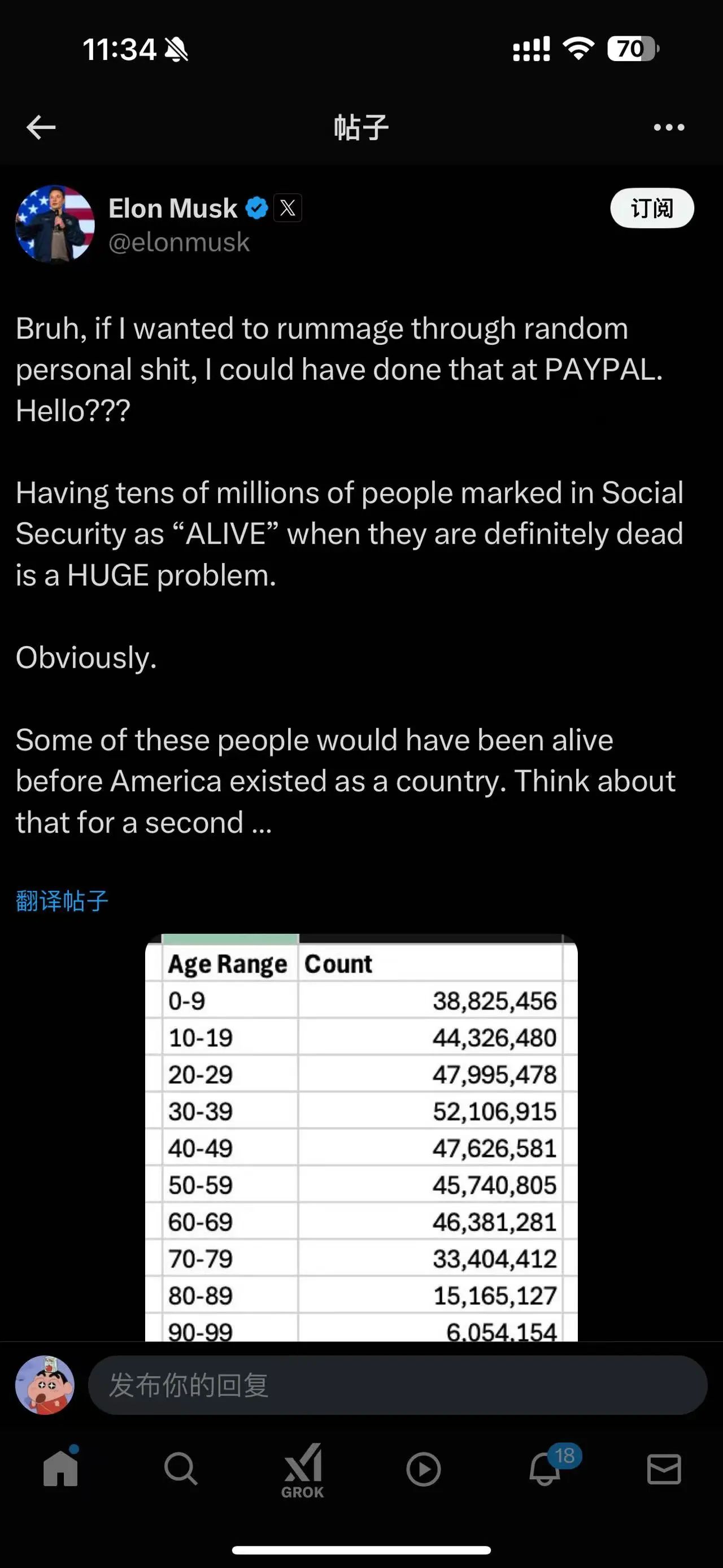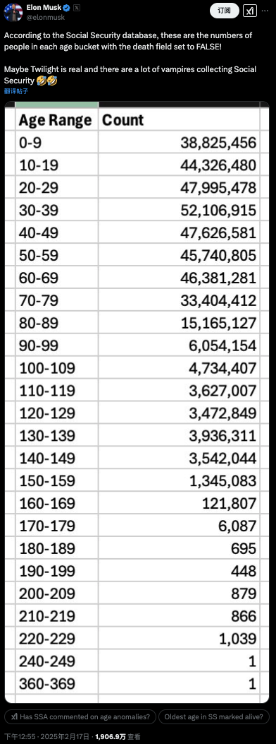 馬斯克周一公布了美國社保數據庫中,每個年齡段中“是否死亡”字段設置為否的人數。其中存在兩個問題:人數對不上和年齡太離譜。