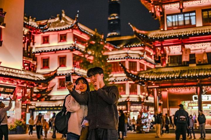 2024年12月4日,來自韓國的游客在上海豫園商城自拍。新華社發(陳浩明攝)