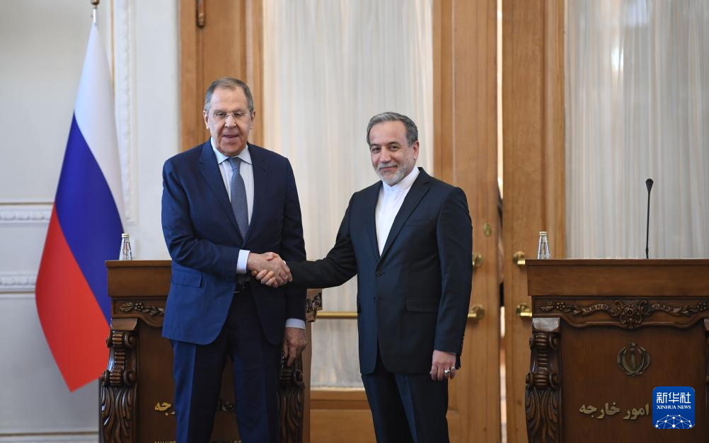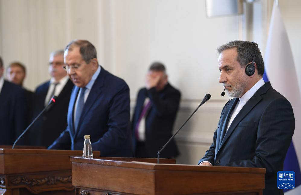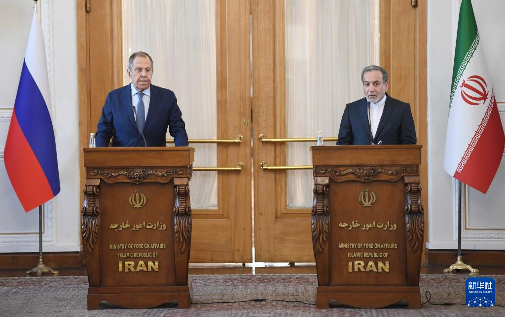 2月25日,在伊朗德黑蘭,伊朗外交部長阿拉格齊(右)與俄羅斯外長拉夫羅夫出席聯合新聞發布會。新華社記者 沙達提 攝