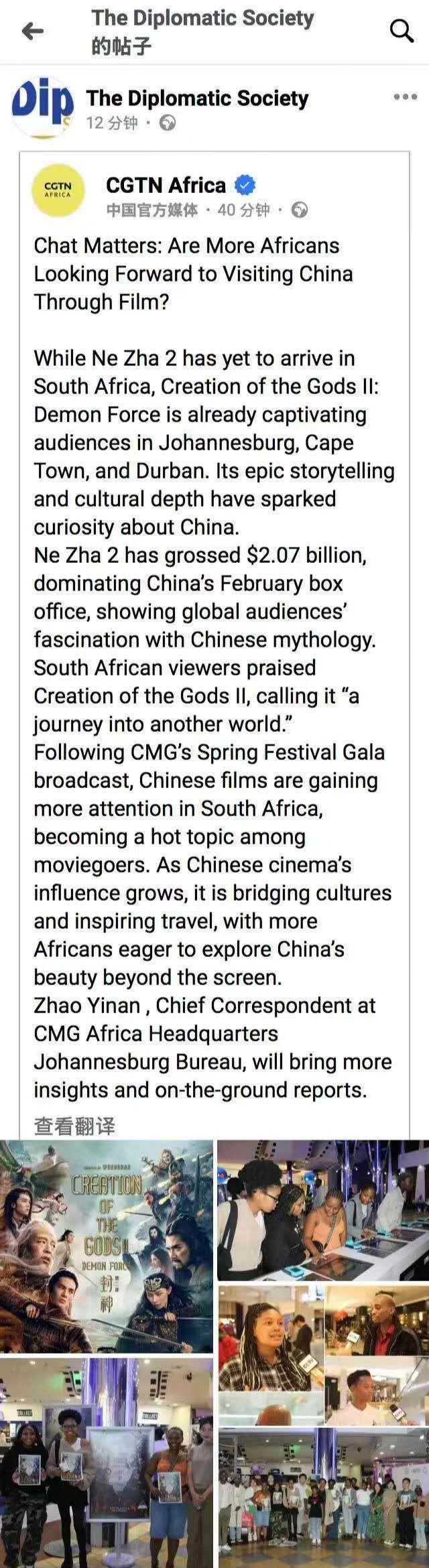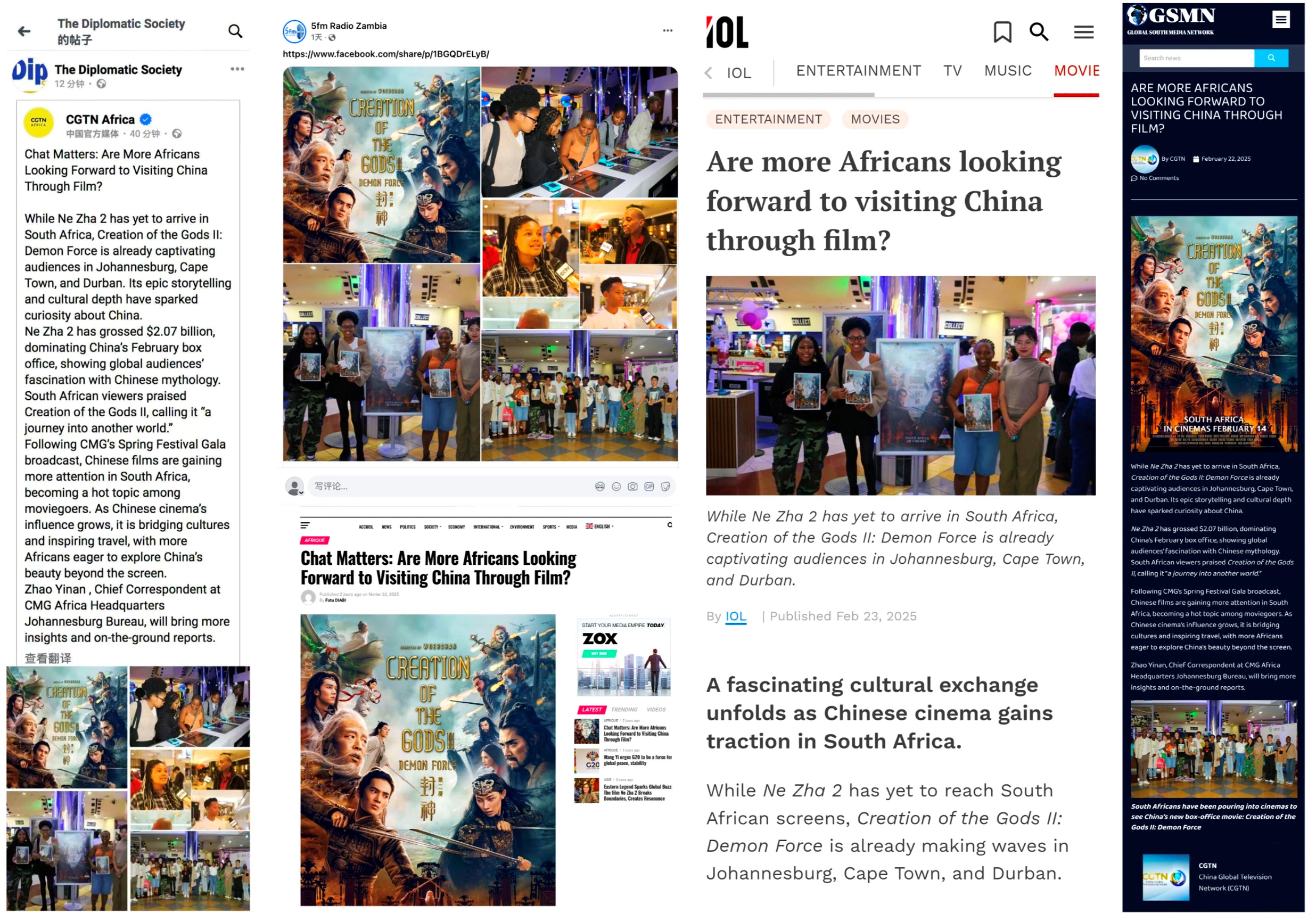 此外,中國春節(jié)檔電影登陸非洲并引發(fā)廣泛影響的相關報道被肯尼亞廣播公司、南非獨立傳媒、南非《外交圈報》、全球南方新聞網、贊比亞5fm電臺、津巴布韋廣播公司、岡比亞之聲、剛果新聞網等多家媒體轉引轉載,觸達超1億受眾。