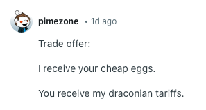“特朗普一邊打關(guān)稅戰(zhàn),一邊討要雞蛋。要不把關(guān)稅戰(zhàn)停下,我們再談雞蛋?”