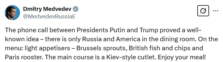 俄羅斯總統普京同特朗普18日通電話。俄聯邦安全會議副主席梅德韋杰夫就此表態稱,這表明餐廳里只有俄美,歐洲和烏克蘭都在菜單上,歐洲是開胃小菜,而主菜是烏克蘭。