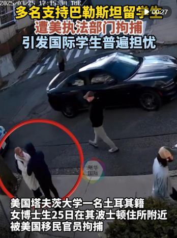 新華社北京3月28日電 據(jù)美國媒體報(bào)道,塔夫茨大學(xué)土耳其籍博士生魯梅伊莎·厄茲蒂爾克25日在其波士頓住所附近遭美國移民官員拘捕。自唐納德·特朗普就任總統(tǒng)以來,已有多名在美外國留學(xué)生因支持巴勒斯坦而遭拘捕或被驅(qū)逐出境。