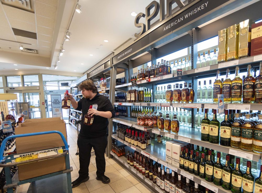 2025年3月4日,在加拿大安大略省的奧克維爾,一酒商門店的店員從貨架上撤下美國品牌酒產品。新華社發(鄒崢攝)