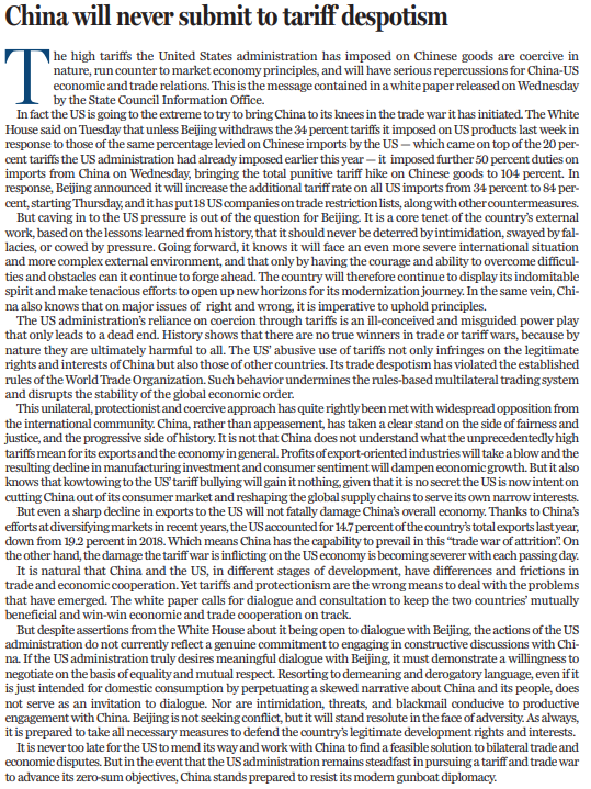 美國若能改邪歸正,與中國攜手合作,共同尋找解決雙邊經貿摩擦的可行路徑,尚為時不晚。當然,如果美國政府執意用關稅戰、貿易戰搞零和博弈,那么中國也已做好準備,堅決抵御美國向中國擺出的炮艦外交。