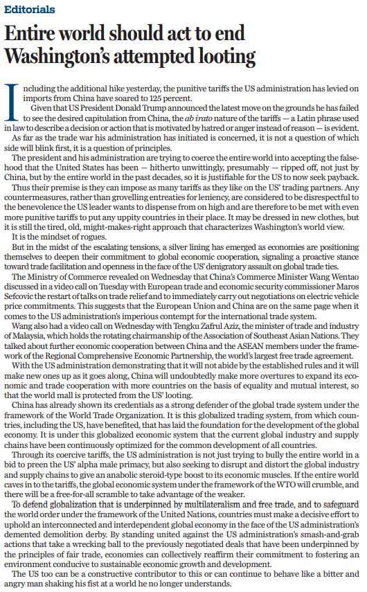 美國政府試圖脅迫全世界接受這樣一個謊言,即美國在過去幾十年中不僅被中國,而且被整個世界所欺騙,因此美國現在加征關稅是理所當然的。其他國家如果不卑躬屈膝地請求“寬大處理”,甚至采取反制措施,就會被視為對美方大不敬,美國將加以更高的懲罰性關稅,迫使敢于反抗的國家俯首稱臣。華盛頓的世界觀也許披上了新衣,但仍然是老套的“強權即公理”,完全是流氓心態和強盜邏輯。