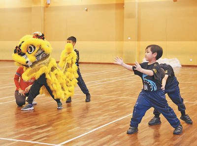 馬來西亞雪蘭莪州培才二校的學生在練習舞獅。 本報記者 楊 一攝