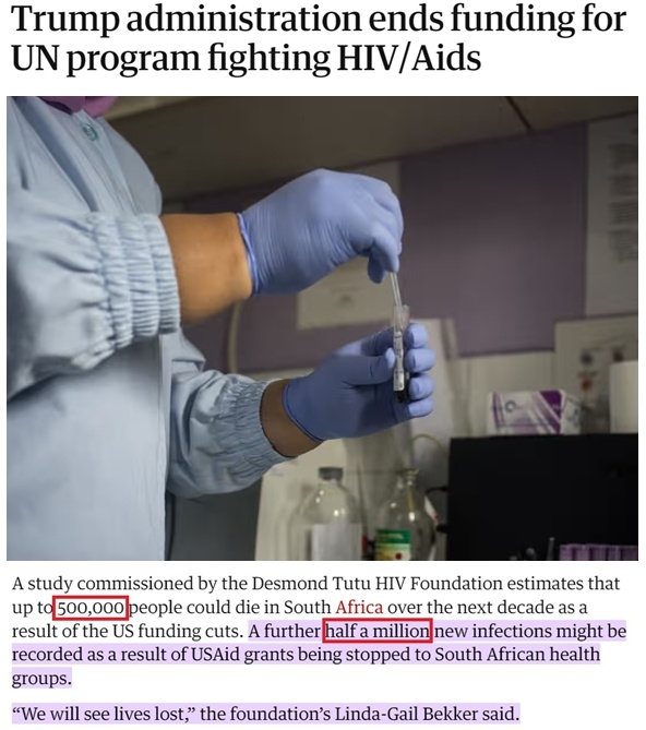 南非德斯蒙德·圖圖艾滋病中心主任琳達-蓋爾·貝克爾告訴記者,美國取消對當地抗艾組織的資助將導致“超過50萬不必要的死亡以及多達50萬新增感染病例”,使有關方面“過去25年的所有努力付諸東流”。