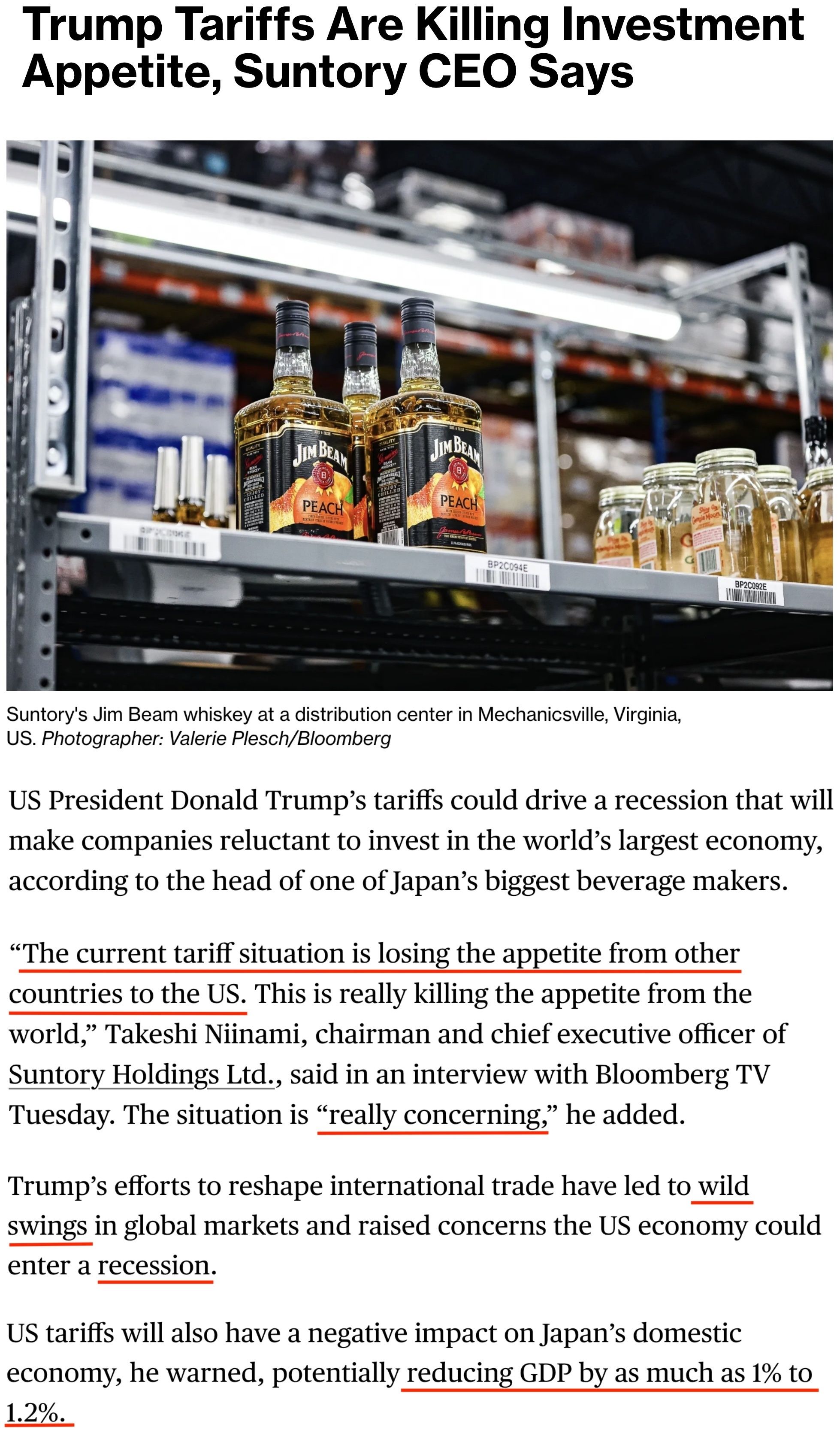 日本首相辦公室高級經濟顧問、日本最大飲料制造商之一三得利公司董事長兼首席執行官新浪剛史22日接受彭博社采訪時警告,美國的關稅措施已導致全球市場劇烈波動,可能引發美國經濟衰退,并削弱其他國家對美國的投資意愿。