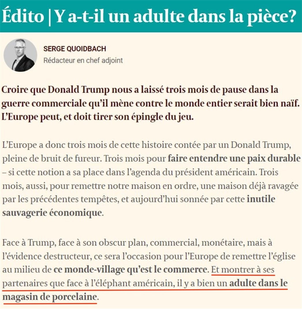 比利時《回聲報》近日發表評論文章指出,面對反復無常的特朗普政府,歐洲不應存有任何幻想,而應“直面美國帶來的喧囂與動蕩”,做好自己的事。