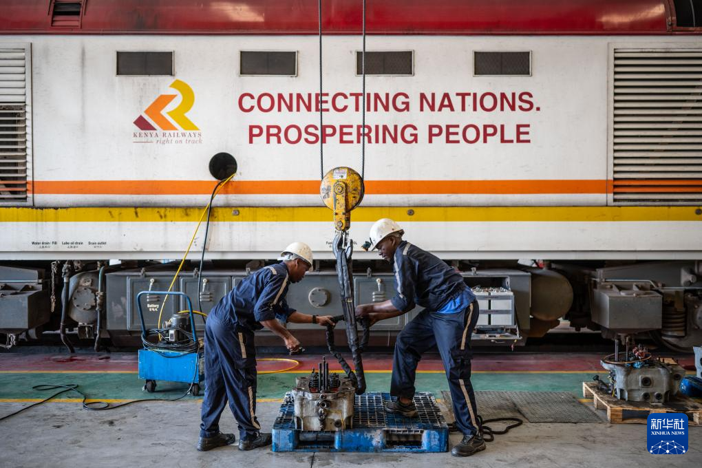 2025年1月23日,在肯尼亞內羅畢蒙內鐵路車間,維保人員在一輛印有“連接國家 走向繁榮”標語的蒙內鐵路機車前檢修配件。 新華社記者 王冠森 攝