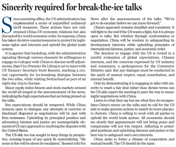 近期,美方不斷表示,希望同中方就關稅調整進行談判。當地時間10日上午,中美經貿高層會談在瑞士日內瓦開始舉行。中共中央政治局委員、國務院副總理何立峰作為中美經貿中方牽頭人,當天與美方牽頭人、美國財長貝森特舉行會談。中美關稅戰迎來破冰契機。