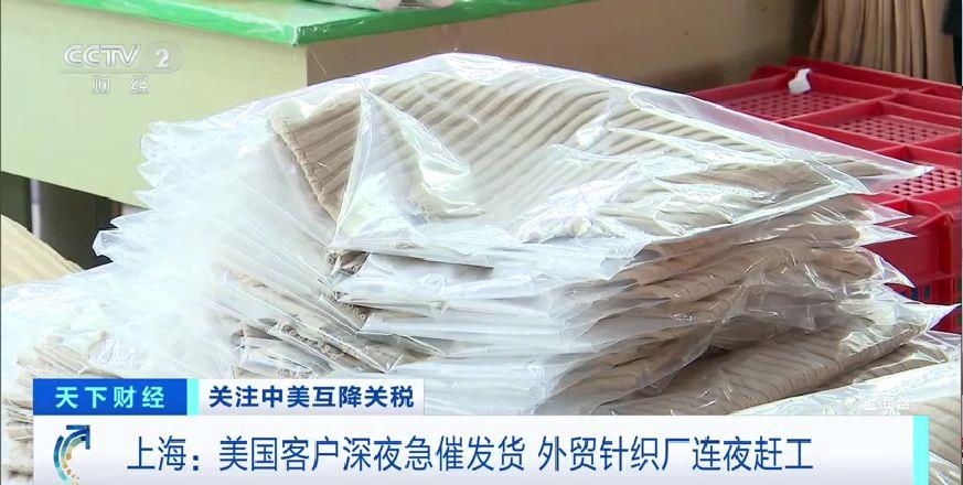 在中美大幅互降關(guān)稅后,位于上海松江區(qū)李塔匯鎮(zhèn)的一家針織廠,接到了美國客戶可以出貨的通知。已經(jīng)在包裝車間里堆了1個月的50000多件成衣,終于可以開啟最后的工序,車間內(nèi)的工人全員上崗,縫商標(biāo)、熨燙、打吊牌,各個工序有條不紊。