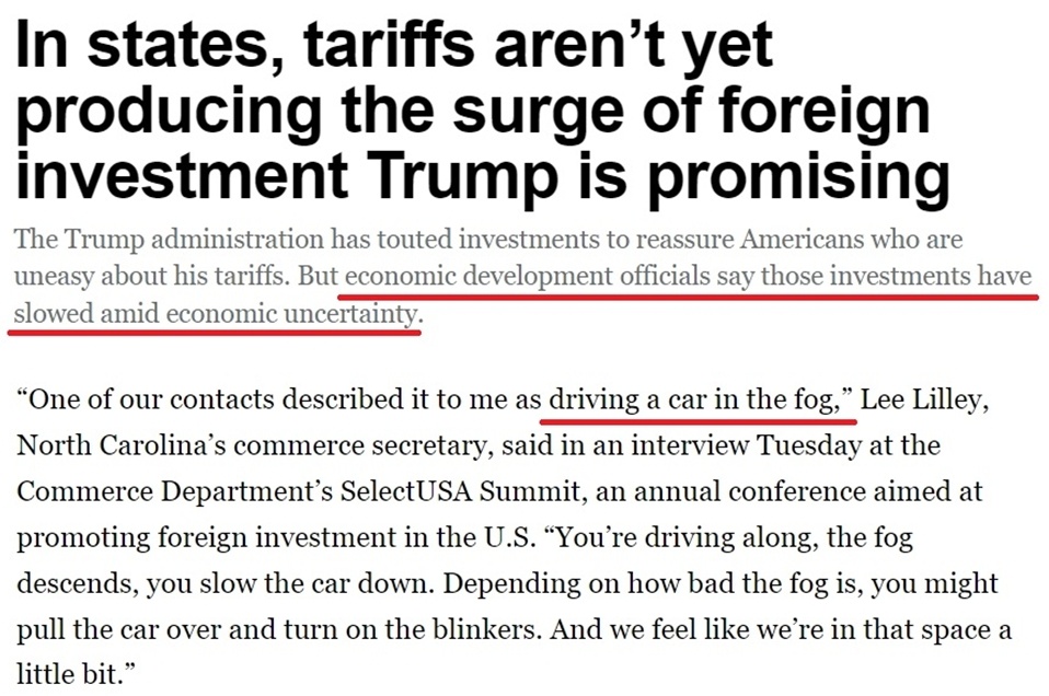 美國政府一直宣稱,加征關(guān)稅將為美國吸引數(shù)萬億美元的外國投資。但據(jù)美國《政治報(bào)》報(bào)道,來自美國多個(gè)州的政府官員和議員都抱怨說,白宮關(guān)稅政策引發(fā)的不確定性正在阻礙外資進(jìn)入美國市場。