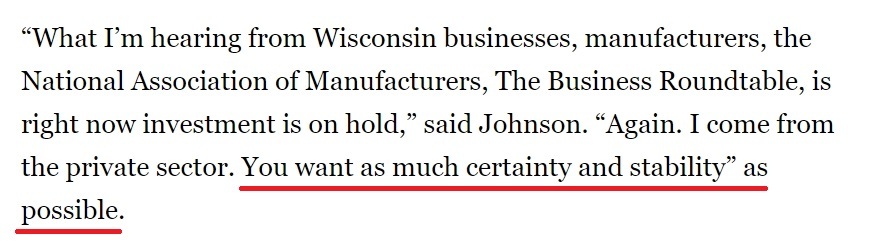 “我從本州的企業(yè)、制造商以及全美制造商協(xié)會和商業(yè)圓桌會議那里聽到的消息是,許多外商原定的投資計(jì)劃已經(jīng)被擱置。我本人來自私營企業(yè),我知道企業(yè)最需要的就是盡可能多的確定性和穩(wěn)定性?!?/p>