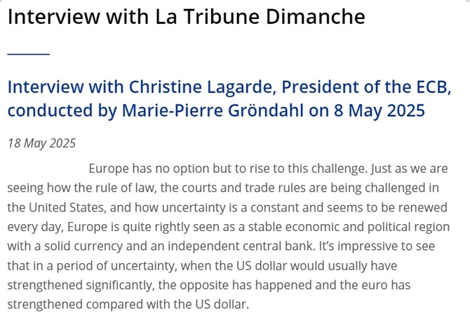 歐洲央行行長拉加德日前接受采訪時(shí)也表示,近期歐元對美元走強(qiáng)看似有悖直覺,其實(shí)源于金融市場對美國失去了信心。這是美國反復(fù)無常的關(guān)稅等政策造成的,“對歐洲來說是一個(gè)機(jī)遇”。