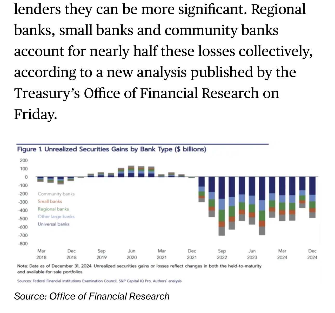 文章回憶道,2022年和2023年,美國國債和抵押貸款債券的“未實現損失”成為貸款機構的一大擔憂,當時利率大幅上升,引發了以硅谷銀行為首的幾家銀行倒閉。“未實現損失”,是指在某個資產或證券的市場價值低于其購入價格的情況下,尚未出售或平倉的投資組合中的損失。
