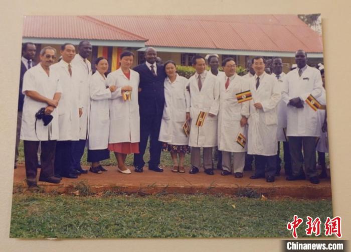圖為1998年,烏干達總統(tǒng)穆塞韋尼(中間著黑西服)看望中國醫(yī)療隊照片。中新網(wǎng)記者陳晨 攝