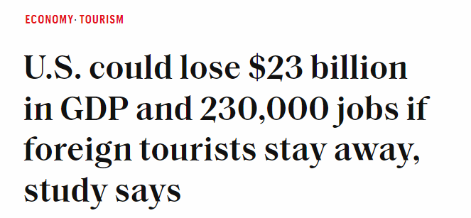 經濟分析公司Implan首席經濟學家珍妮弗·索瓦爾德森(Jennifer Thorvaldson)測算稱,基于3月份外國游客赴美人數下降的情況,若今年國際游客減少10%,不僅美國國內生產總值(GDP)將損失230億美元,還會損失大約23萬個工作崗位。
