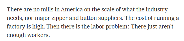 文章說,特朗普政府的高額關稅給企業帶來了巨大壓力,迫使企業的負責人一直在思考自己能在美國多生產多少產品。但是,美國既沒有滿足該行業需求的規模工廠,也沒有主要的拉鏈和紐扣供應商。運營工廠的成本很高。此外還有勞動力問題:工人根本不夠用。