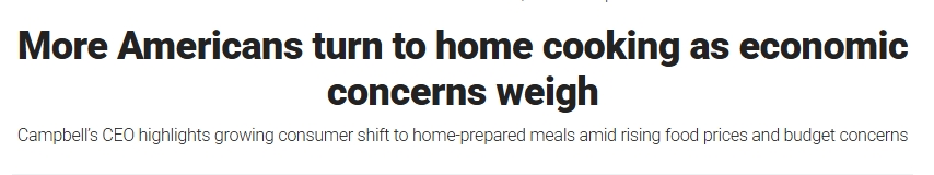 福克斯財經(Fox Business)的報道援引了罐頭食品生產商金寶湯(Campbell's)首席執行官米克·比克胡伊森的話稱,隨著經濟擔憂加劇,更多美國家庭選擇在家烹飪以節省開支。他近期在其公司第三季度財報電話會議上告訴分析師,整個季度消費者情緒持續疲軟,購物者在食品支出上變得更加謹慎。