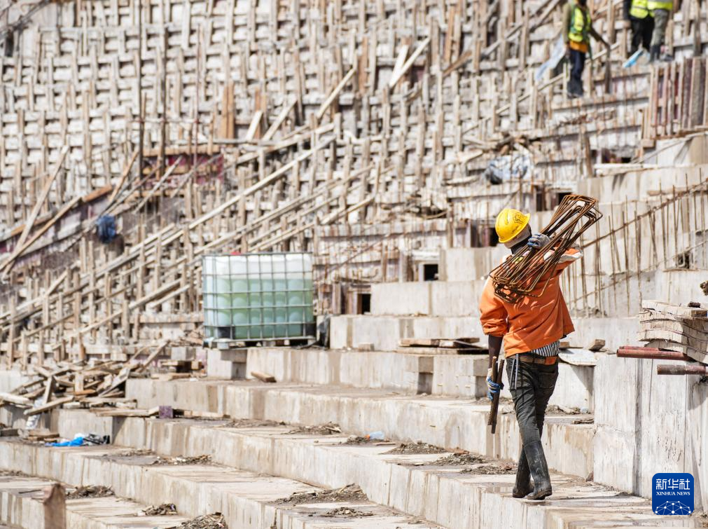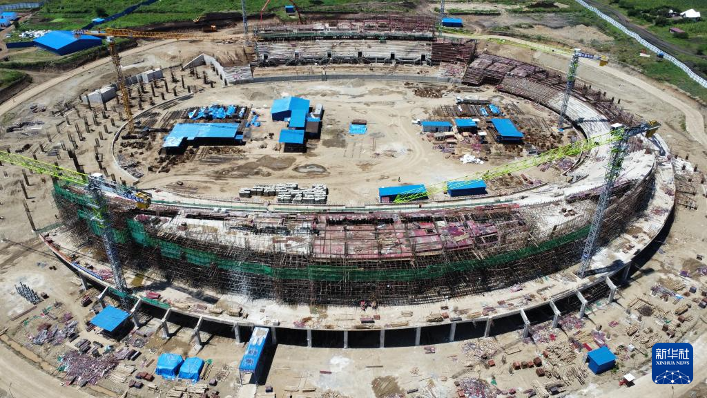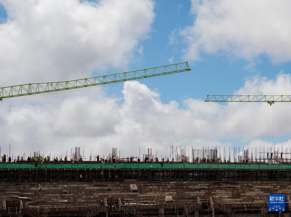 這是坦桑尼亞北部城市阿魯沙的一片繁忙工地:六座高聳的塔吊伸展著鋼鐵巨臂,在高空精準吊運建材;焊接聲、機械轟鳴聲與指令聲此起彼伏,交織成一首建設交響曲;上千名工人頭戴安全帽、身著反光背心,正全力拉滿施工“進度條”……一座現代化體育場已初具雛形。