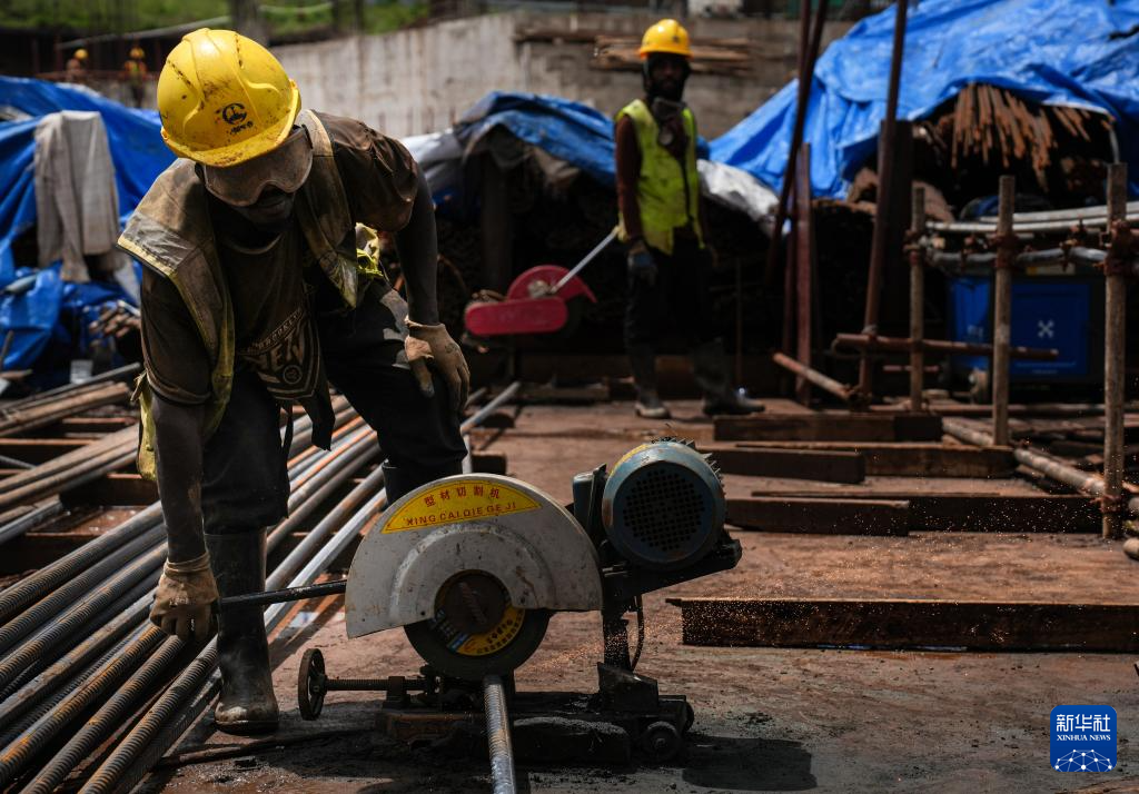 4月25日,在坦桑尼亞阿魯沙綜合體育場項目上,工人用切割機切割鋼筋。新華社記者 李亞輝 攝