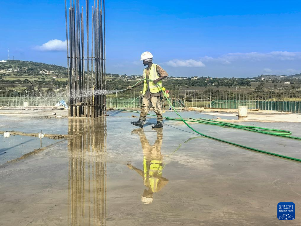 2月10日,在坦桑尼亞阿魯沙綜合體育場項目上,工人進行混凝土養護作業。新華社發(中國中鐵建工集團有限公司供圖)