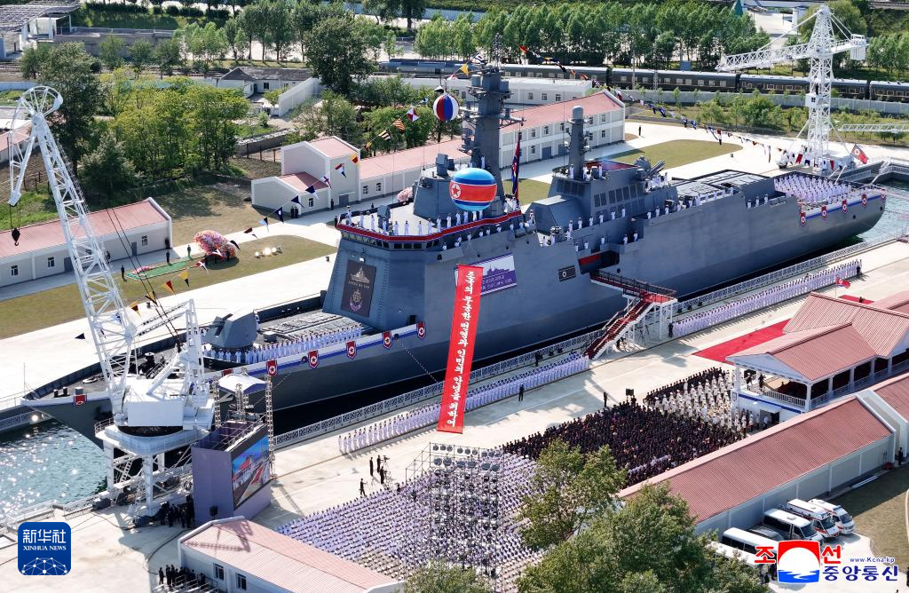 這是朝中社發布的朝鮮“崔賢”級二號艦下水儀式現場畫面。新華社/朝中社