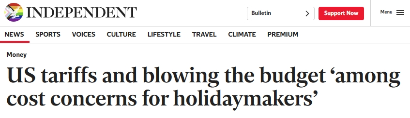 此外,美國關稅政策的影響已外溢至國際層面,甚至影響了外國民眾的出行計劃。英國《獨立報》援引的一項報告顯示,78%的受訪者擔心美國貿易關稅可能對國外目的地的價格造成影響;53%的人計劃避開那些他們認為關稅可能會推高國外目的地的物價;77%的人表示,匯率是他們的一大擔憂。