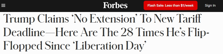 對于此次關稅調整,《福布斯》雜志網站7日報道指出,從今年2月7日首次公開提及對他國進口商品征收全面關稅,到強調“2025年8月1日這一日期不會有任何延長”的這五個月里,特朗普政府在關稅問題上的態度“翻轉”了大約28次。
