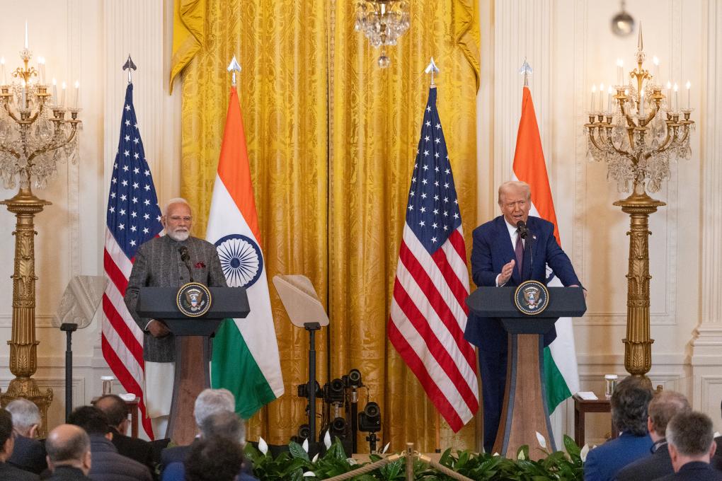 2月13日,美國總統特朗普(右)與到訪的印度總理莫迪在華盛頓白宮出席聯合記者會。新華社記者胡友松攝