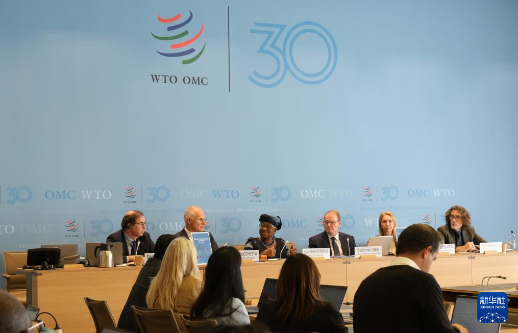 10月7日,在瑞士日內(nèi)瓦世界貿(mào)易組織總部,世貿(mào)組織總干事伊維拉(后左三)在新聞發(fā)布會(huì)上講話。新華社記者 馬汝軒 攝
