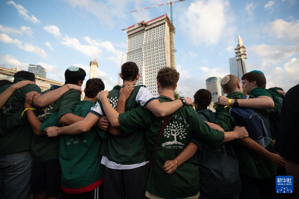 10月9日,在以色列特拉維夫,人們獲悉加沙?;饏f議的消息后相互慶祝,期待被扣押的人員早日獲釋。新華社記者 陳君清 攝
