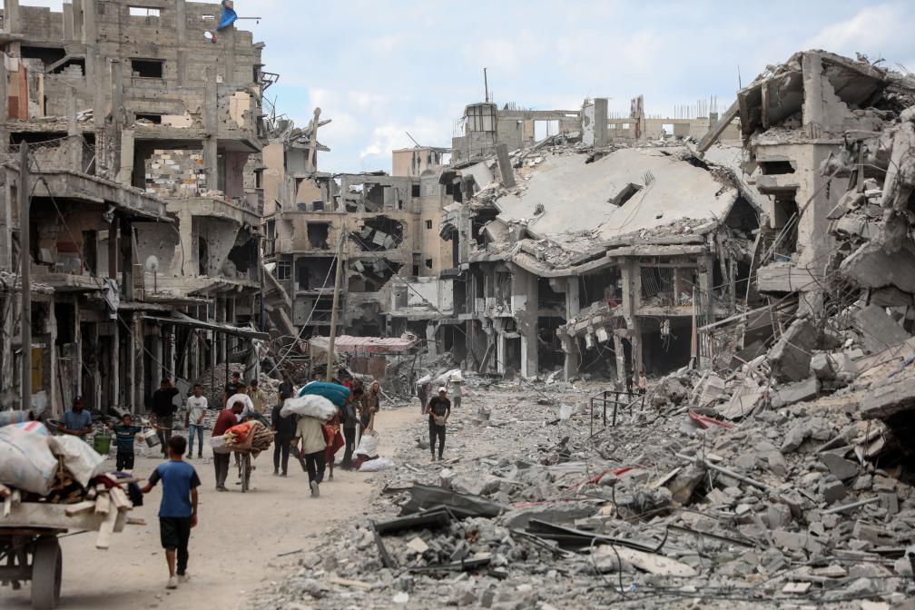 10月12日,在加沙地帶南部汗尤尼斯,重返家園的巴勒斯坦人走過嚴重受損的建筑。新華社發(里澤克·阿卜杜勒賈瓦德攝)