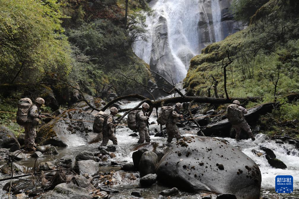 2025年11月2日,巡邏途中,西藏軍區某團一級上士次羅布(右一)和戰友們跋山涉水。新華社發(于達 攝)