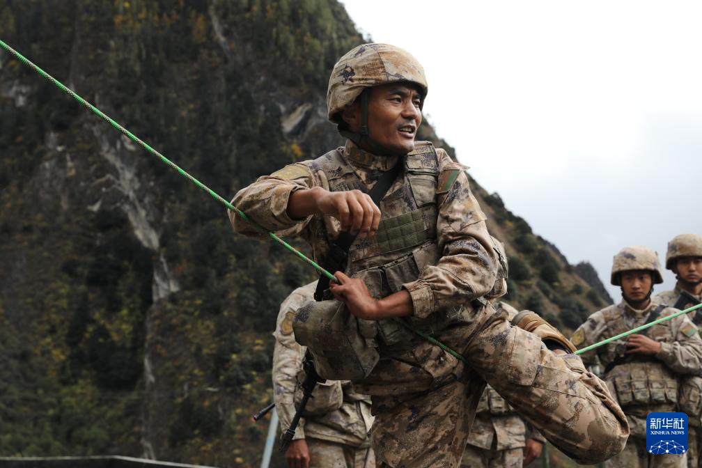 2025年11月1日,西藏軍區某團一級上士次羅布給戰友示范戰術動作。新華社發(于達 攝)