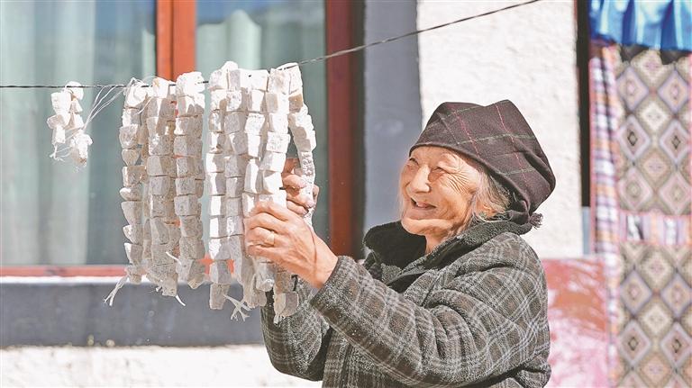 墨竹工卡縣日多鄉拉龍村一位老人在晾曬奶渣。記者 格桑倫珠 攝