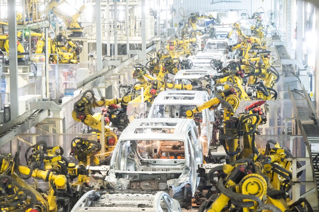 4月1日,在位于湖北武漢市經(jīng)開(kāi)區(qū)的嵐圖汽車(chē)電動(dòng)化焊裝車(chē)間,機(jī)器人在流水線(xiàn)上作業(yè)。新華社記者 肖藝九 攝